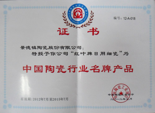 經(jīng)過嚴(yán)格的評定,中國陶瓷工業(yè)協(xié)會近期公布了最新的“2012中國陶瓷行業(yè)名牌產(chǎn)品”榮譽榜單。經(jīng)過數(shù)輪的激烈角逐評選,公司 “紅葉”牌日用陶瓷名列榜單。