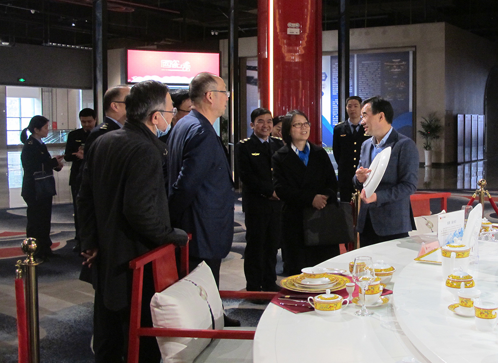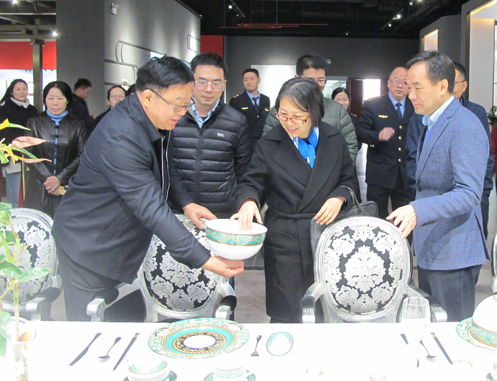 在國(guó)瓷館參觀考察期間,周敏建向調(diào)研組一行簡(jiǎn)要介紹了集團(tuán)公司發(fā)展歷程。大家邊走邊看,不時(shí)駐足拿起產(chǎn)品仔細(xì)品鑒或拍照。周敏建在介紹“國(guó)瓷紅葉”產(chǎn)品特色時(shí)詳細(xì)講解了陶瓷生產(chǎn)工藝,講述了一套套有關(guān)“國(guó)瓷”的故事。